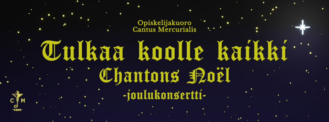 Tervetuloa Cantus Mercurialiksen joulukonserttiin! Konsertti järjestetään Mikaelinkirkossa 29.11.2025 klo 18 alkaen. Konsertin johtaa Ville-Veikko Verha. Konsertin kesto on noin yksi tunti. Liput voit ostaa ennakkoon verkkokaupasta https://cantusmercurialis.eventiolive.fi. Lipun hinta on 12 € / 14 €. Alennusryhmä: eläkeläiset / varusmiehet / opiskelijat / työttömät. Alle 12-vuotiaat ilmaiseksi. Tervetuloa!